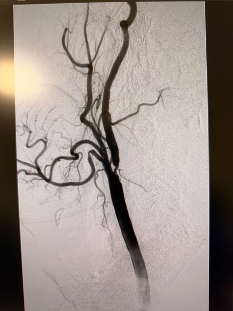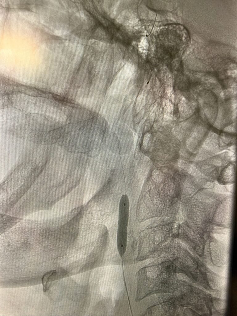 Mediante un abordaje percutáneo por arteria femoral, utilizamos filtros de protección cerebral para minimizar el riesgo de embolias durante la intervención. Posteriormente, efectuamos la dilatación con balón y la colocación de un stent de celdas cerradas, logrando una revascularización segura y eficaz, sin necesidad de cirugía a cielo abierto.
